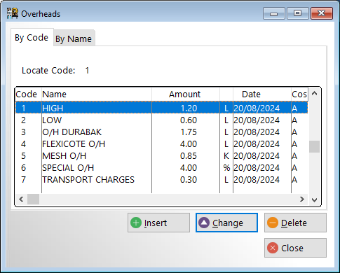 This will open a window showing the existing list of overheads. Click <Insert> to add a new overhead.