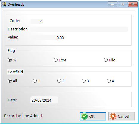 Costfield: A to apply to all cost fields (default) 1, 2 , 3 or 4 to apply ONLY to the selected cost field. This means that you can have separate sets of overheads for each cost field.
