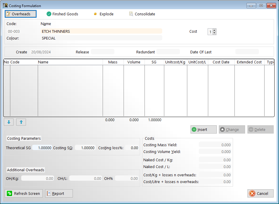 The overheads are applied in the form of overhead parameters. These overhead parameters are similar to raw material cost entries in that once entered they may be called up for use in any formulations (or finished goods items).