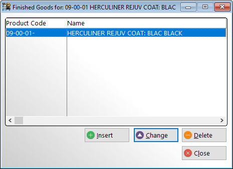 On pressing 'Insert' or 'Change', the following window is opened allowing entry of finished goods components.