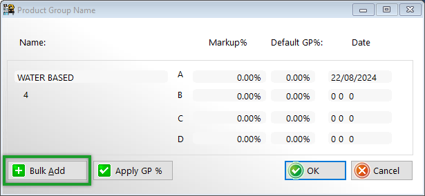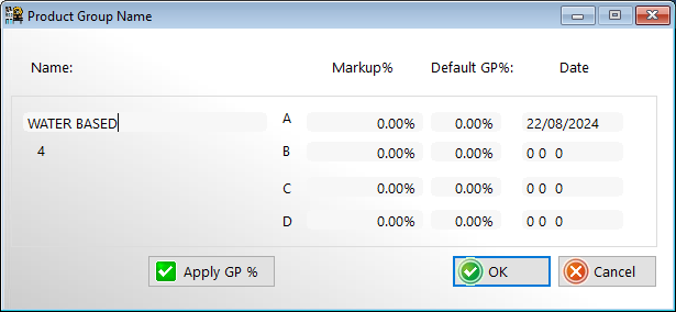 Group Name: Enter the name of the product group e.g. 'WATER BASED'