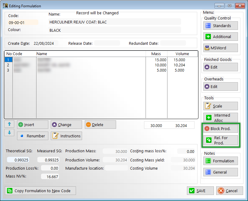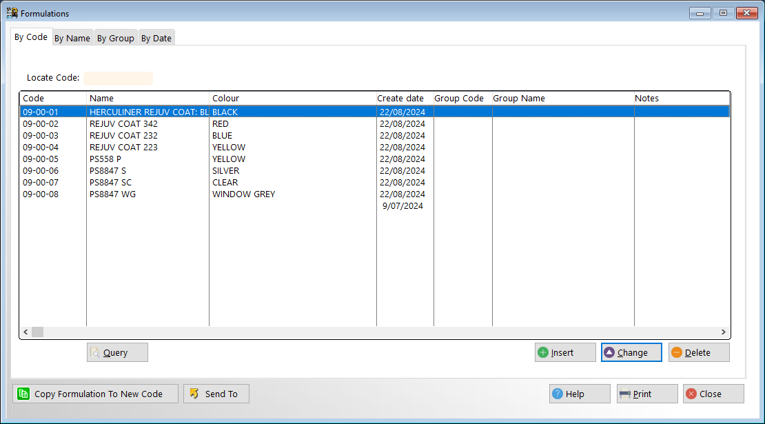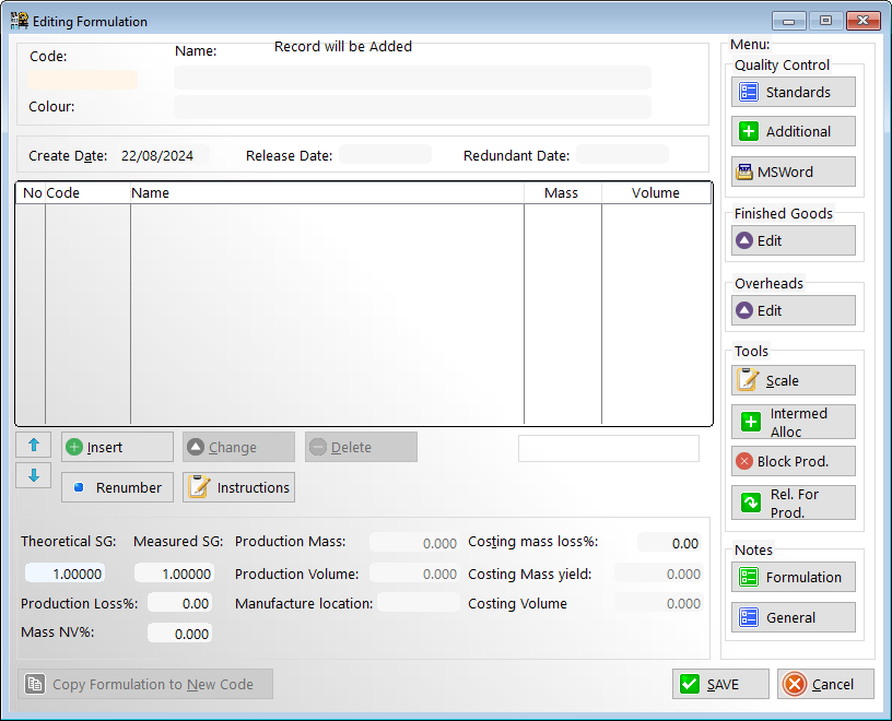 The formulation code, name, colour and date of creation are entered here. The code must be unique.