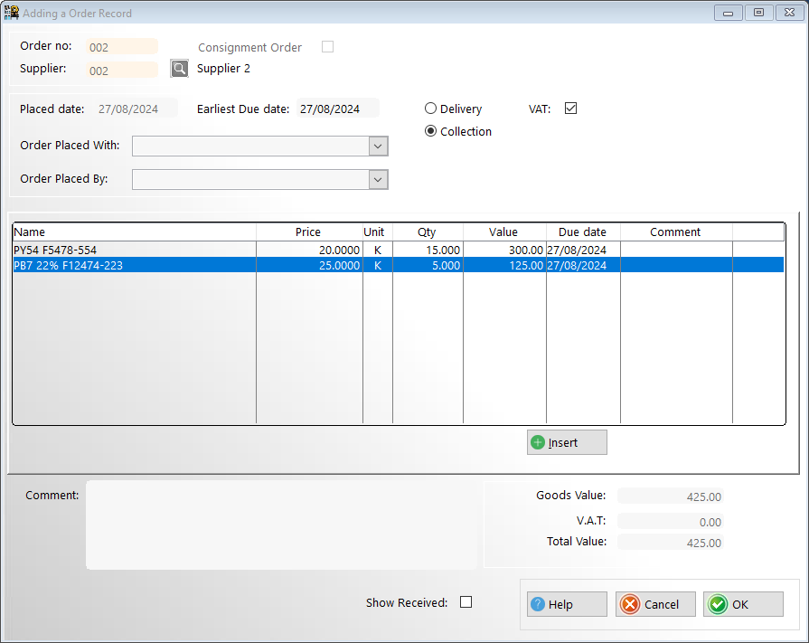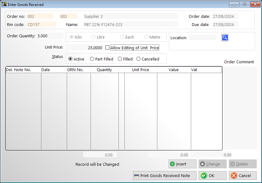 The ordered item details will be displayed together with any receipts already entered for this item.