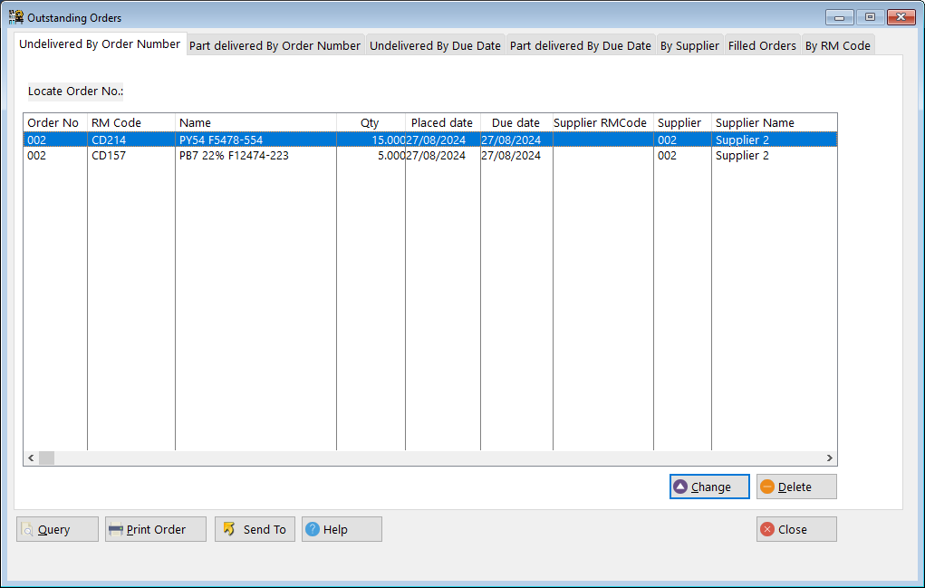 This window shows you a list of all your undelivered/outstanding orders, by order number.